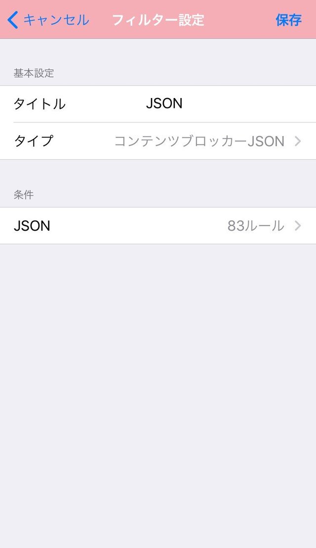 フィルター設定のタイプに「コンテンツブロッカーJSON」を指定します。